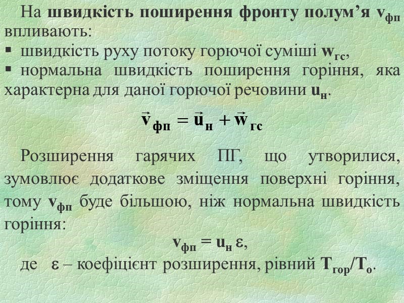 На швидкість поширення фронту полум’я vфп впливають: швидкість руху потоку горючої суміші wгс, нормальна швидкість поширення горіння, яка характерна для даної горючої речовини uн. Розширення гарячих ПГ, що утворилися, зумовлює додаткове зміщення поверхні горіння, тому vфп буде більшою, ніж нормальна швидкість горіння: vфп = uн e, де e – коефіцієнт розширення, рівний Тгор/То.
