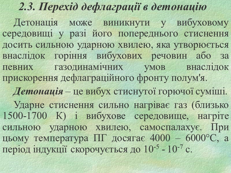 2.3. Перехід дефлаграції в детонацію Детонація може виникнути у вибуховому середовищі у разі його попереднього стиснення досить сильною ударною хвилею, яка утворюється внаслідок горіння вибухових речовин або за певних газодинамічних умов внаслідок прискорення дефлаграційного фронту полум'я. Детонація – це вибух стиснутої горючої суміші. Ударне стиснення сильно нагріває газ (близько 1500-1700 К) і вибухове середовище, нагріте сильною ударною хвилею, самоспалахує. При цьому температура ПГ досягає 4000 – 6000°С, а період індукції скорочується до 10-5 - 10-7 с.