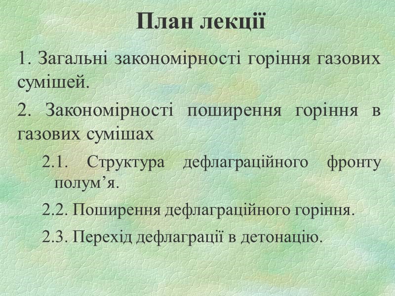 План лекції 1. Загальні закономірності горіння газових сумішей. 2. Закономірності поширення горіння в газових сумішах 2.1. Структура дефлаграційного фронту полум’я. 2.2. Поширення дефлаграційного горіння. 2.3. Перехід дефлаграції в детонацію.
