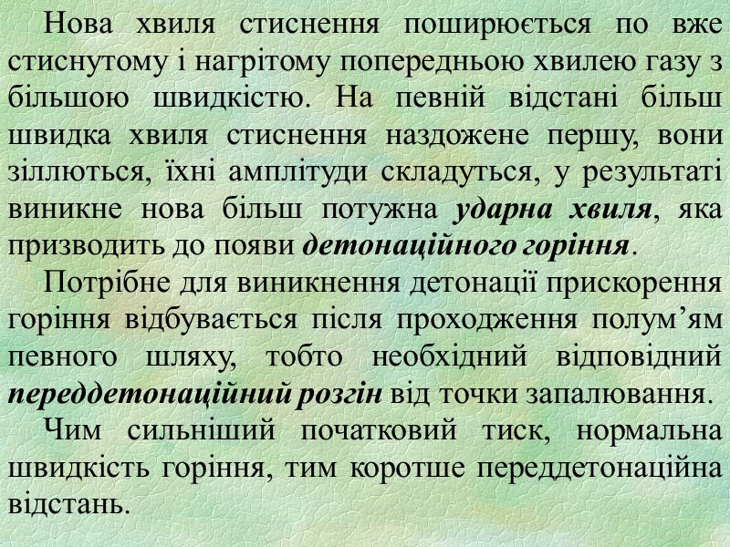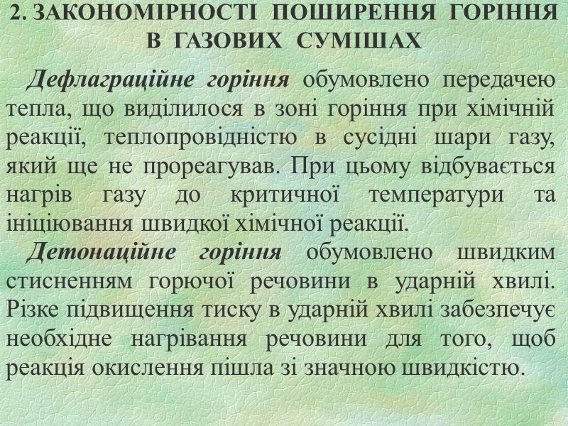 2. ЗАКОНОМІРНОСТІ ПОШИРЕННЯ ГОРІННЯ В ГАЗОВИХ СУМІШАХ Дефлаграційне горіння обумовлено передачею тепла, що виділилося в зоні горіння при хімічній реакції, теплопровідністю в сусідні шари газу, який ще не прореагував. При цьому відбувається нагрів газу до критичної температури та ініціювання швидкої хімічної реакції. Детонаційне горіння обумовлено швидким стисненням горючої речовини в ударній хвилі. Різке підвищення тиску в ударній хвилі забезпечує необхідне нагрівання речовини для того, щоб реакція окислення пішла зі значною швидкістю.