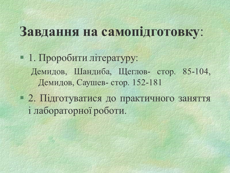 Завдання на самопідготовку: 1. Проробити літературу: Демидов, Шандиба, Щеглов- стор. 85-104, Демидов, Саушев- стор. 152-181 2. Підготуватися до практичного заняття і лабораторної роботи.