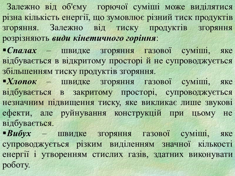 Залежно від об'єму горючої суміші може виділятися різна кількість енергії, що зумовлює різний тиск продуктів згоряння. Залежно від тиску продуктів згоряння розрізняють види кінетичного горіння: Спалах – швидке згоряння газової суміші, яке відбувається в відкритому просторі й не супроводжується збільшенням тиску продуктів згоряння. Хлопок – швидке згоряння газової суміші, яке відбувається в закритому просторі, супроводжується незначним підвищення тиску, яке викликає лише звукові ефекти, але руйнування конструкцій при цьому не відбувається. Вибух – швидке згоряння газової суміші, яке супроводжується різким виділенням значної кількості енергії і утворенням стислих газів, здатних виконувати роботу.