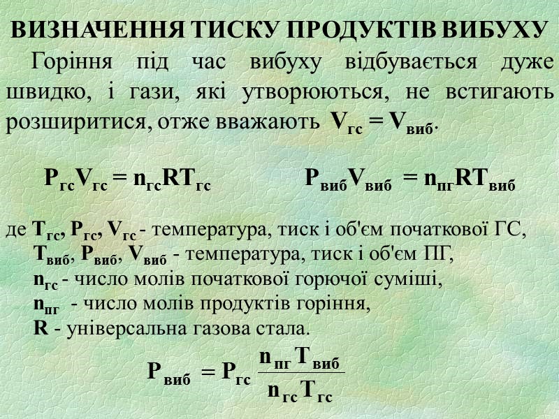 ВИЗНАЧЕННЯ ТИСКУ ПРОДУКТІВ ВИБУХУ Горіння під час вибуху відбувається дуже швидко, і гази, які утворюються, не встигають розширитися, отже вважають Vгс = Vвиб. PгсVгс = nгсRTгс PвибVвиб = nпгRTвиб де Тгс, Ргс, Vгс - температура, тиск і об'єм початкової ГС, Твиб, Рвиб, Vвиб - температура, тиск і об'єм ПГ, nгс - число молів початкової горючої суміші, nпг - число молів продуктів горіння, R - універсальна газова стала.