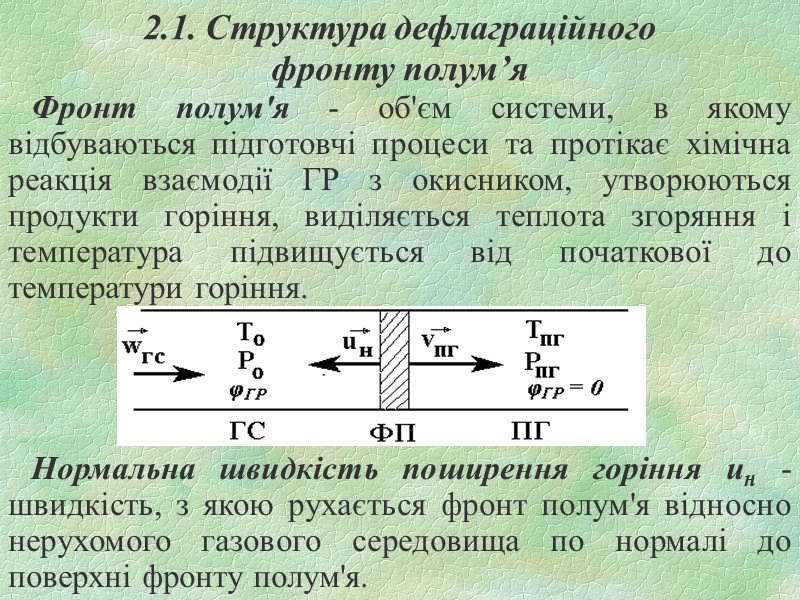 2.1. Структура дефлаграційного фронту полум’я Фронт полум'я - об'єм системи, в якому відбуваються підготовчі процеси та протікає хімічна реакція взаємодії ГР з окисником, утворюються продукти горіння, виділяється теплота згоряння і температура підвищується від початкової до температури горіння. Нормальна швидкість поширення горіння uн - швидкість, з якою рухається фронт полум'я відносно нерухомого газового середовища по нормалі до поверхні фронту полум'я.