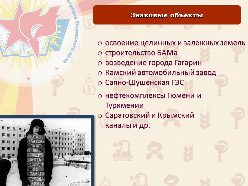 Знаковые объекты освоение целинных и залежных земель строительство БАМа возведение города Гагарин Камский автомобильный завод Саяно-Шушенская ГЭС нефтекомплексы Тюмени и Туркмении Саратовский и Крымский каналы и др.