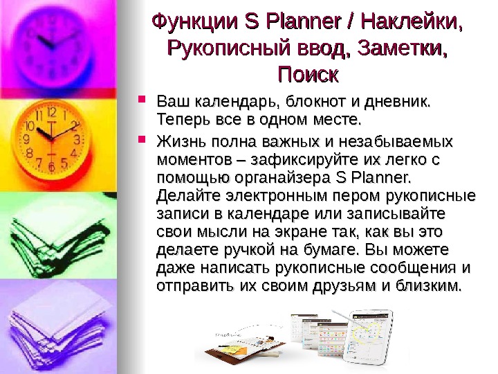 Функции S Planner / Наклейки, Рукописный ввод, Заметки, Поиск Ваш календарь, блокнот и дневник. Теперь все в одном месте. Жизнь полна важных и незабываемых моментов – зафиксируйте их легко с помощью органайзера S Planner. Делайте электронным пером рукописные записи в календаре или записывайте свои мысли на экране так, как вы это делаете ручкой на бумаге. Вы можете даже написать рукописные сообщения и отправить их своим друзьям и близким.