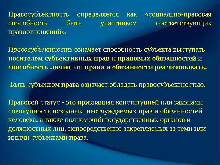 Правосубъектность определяется как «социально-правовая способность быть участником соответствующих правоотношений» . Правосубъектность означает способность субъекта выступать носителем субъективных прав и правовых обязанностей и способность лично эти права и обязанности реализовывать. Быть субъектом права означает обладать правосубъектностью. Правовой статус — это признанная конституцией или законами совокупность исходных, неотчуждаемых прав и обязанностей человека, а также полномочий государственных органов и должностных лиц, непосредственно закрепляемых за теми или иными субъектами права.