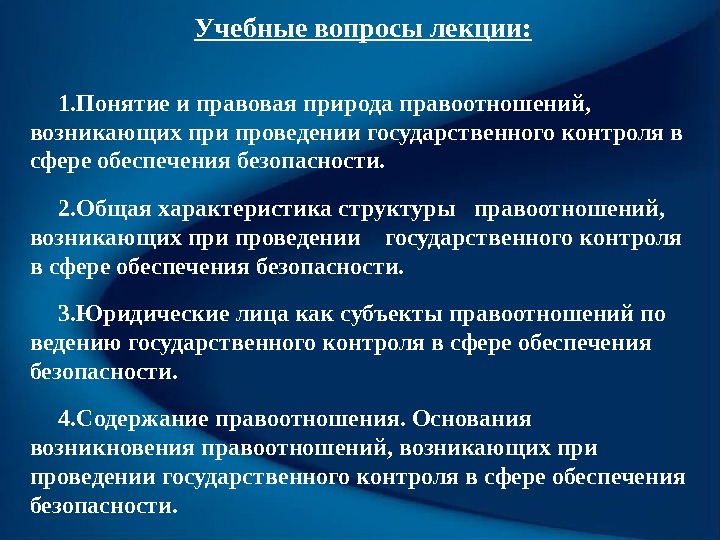 Учебные вопросы лекции: 1. Понятие и правовая природа правоотношений, возникающих при проведении государственного контроля в сфере обеспечения безопасности. 2. Общая характеристика структуры правоотношений, возникающих при проведении государственного контроля в сфере обеспечения безопасности. 3. Юридические лица как субъекты правоотношений по ведению государственного контроля в сфере обеспечения безопасности. 4. Содержание правоотношения. Основания возникновения правоотношений, возникающих при проведении государственного контроля в сфере обеспечения безопасности.