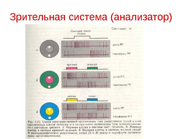 Цветовосприятие Нейроны, обеспечивающие цветовосприятие организованы в глобулы и имеют РП круглой формы. Как видно из рисунка существует два типа цветоопонентных клеток зрительной коры: нейроны 1 типа реагируют на красны и зеленый цвета, а нейроны 2 типа – синий и желтый цвета. Таким образом, для зрительной коры справедлива двухкомпонентная теория цветового зрения Геринга, в отличие от сетчатки, в которой имеются 3 типа цветовых рецепторов, чувствительных в красной, желто-зеленой и синей частях спектра. Таким образом, для сетчатки справедлива 3 -х компонентная теория цветового зрения Гельмгольца-Ломоносова.