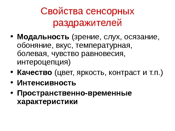 Свойства сенсорных раздражителей • Модальность (зрение, слух, осязание, обоняние, вкус, температурная, болевая, чувство равновесия, интероцепция) • Качество (цвет, яркость, контраст и т. п. ) • Интенсивность • Пространственно-временные характеристики