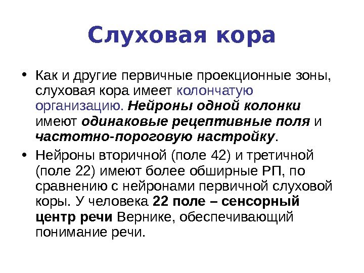 Слуховая кора • Как и другие первичные проекционные зоны, слуховая кора имеет колончатую организацию. Нейроны одной колонки имеют одинаковые рецептивные поля и частотно-пороговую настройку. • Нейроны вторичной (поле 42) и третичной (поле 22) имеют более обширные РП, по сравнению с нейронами первичной слуховой коры. У человека 22 поле – сенсорный центр речи Вернике, обеспечивающий понимание речи.