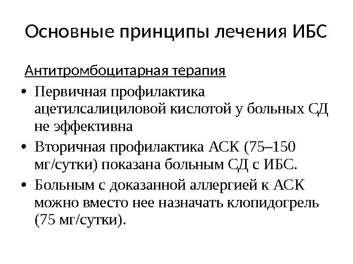 Основные принципы лечения ИБС Антитромбоцитарная терапия • Первичная профилактика ацетилсалициловой кислотой у больных СД не эффективна • Вторичная профилактика АСК (75– 150 мг/сутки) показана больным СД с ИБС. • Больным с доказанной аллергией к АСК можно вместо нее назначать клопидогрель (75 мг/сутки).