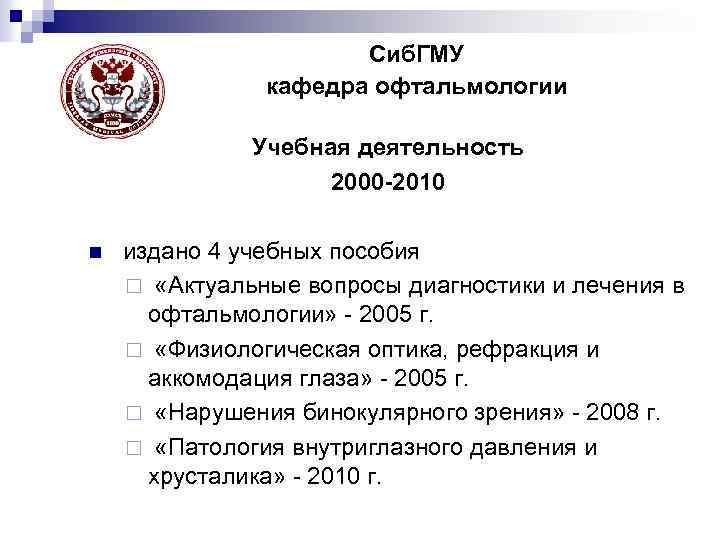 Сиб. ГМУ кафедра офтальмологии Учебная деятельность 2000 -2010 n студенческий научный кружок ¨ 2009 г. – диплом I степени за лучший доклад на Всероссийской 68 итоговой научной студенческой конференции им. Н. И. Пирогова ¨ 2010 г. – диплом II степени за лучший доклад на Всероссийской 69 итоговой научной студенческой конференции им. Н. И. Пирогова