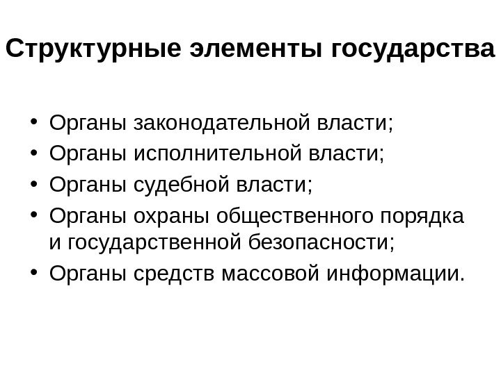 Структурные элементы государства • Органы законодательной власти; • Органы исполнительной власти; • Органы судебной власти; • Органы охраны общественного порядка и государственной безопасности; • Органы средств массовой информации.