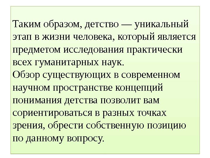 Таким образом, детство — уникальный этап в жизни человека, который является предметом исследования практически всех гуманитарных наук. Обзор существующих в современном научном пространстве концепций понимания детства позволит вам сориентироваться в разных точках зрения, обрести собственную позицию по данному вопросу.
