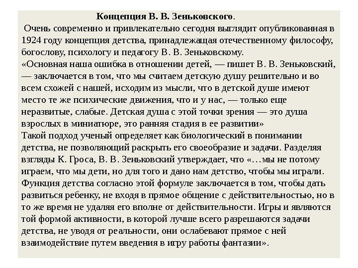 Концепция В. В. Зеньковского. Очень современно и привлекательно сегодня выглядит опубликованная в 1924 году концепция детства, принадлежащая отечественному философу, богослову, психологу и педагогу В. В. Зеньковскому. «Основная наша ошибка в отношении детей, — пишет В. В. Зеньковский, — заключается в том, что мы считаем детскую душу решительно и во всем схожей с нашей, исходим из мысли, что в детской душе имеют место те же психические движения, что и у нас, — только еще неразвитые, слабые. Детская душа с этой точки зрения — это душа взрослых в миниатюре, это ранняя стадия в ее развитии» Такой подход ученый определяет как биологический в понимании детства, не позволяющий раскрыть его своеобразие и задачи. Разделяя взгляды К. Гроса, В. В. Зеньковский утверждает, что «…мы не потому играем, что мы дети, но для того и дано нам детство, чтобы мы играли. Функция детства согласно этой формуле заключается в том, чтобы дать развиться ребенку, не входя в прямое общение с действительностью, но в то же время не удаляя его вполне от действительности. Игры и являются той формой активности, в которой лучше всего разрешаются задачи детства, не уводя от реальности, они ослабевают прямое с ней взаимодействие путем введения в игру работы фантазии» .