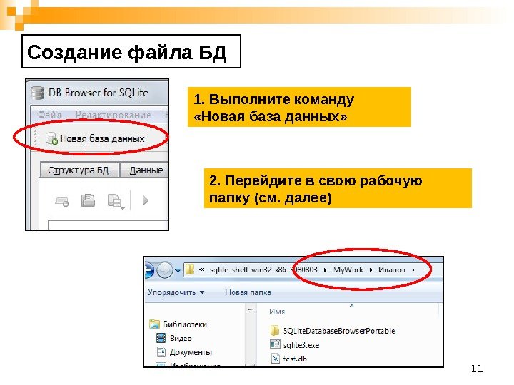 11 Создание файла БД 1. Выполните команду «Новая база данных» 2. Перейдите в свою рабочую папку (см. далее)