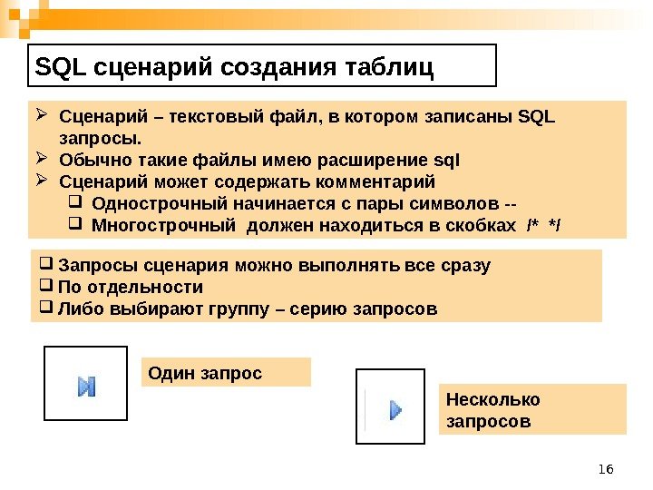 16 SQL сценарий создания таблиц Сценарий – текстовый файл , в котором записаны SQL запросы. Обычно такие файлы имею расширение sql Сценарий может содержать комментарий Однострочный начинается с пары символов — Многострочный должен находиться в скобках /* */ Запросы сценария можно выполнять все сразу По отдельности Либо выбирают группу – серию запросов Один запрос Несколько запросов