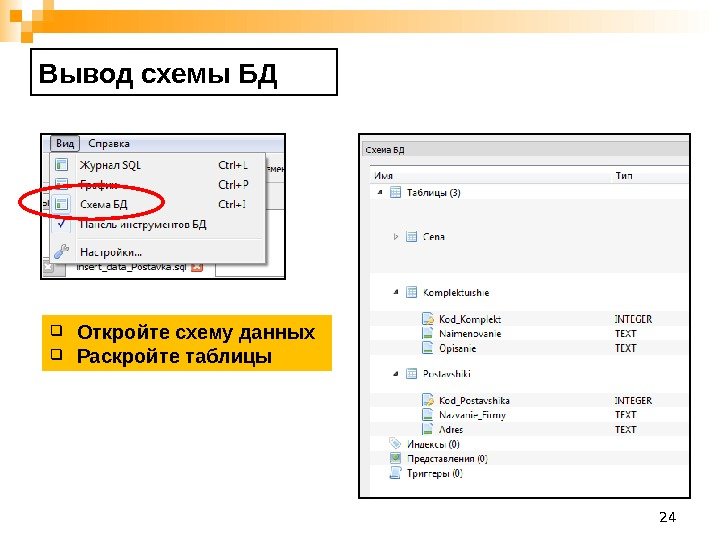 24 Вывод схемы БД Откройте схему данных Раскройте таблицы