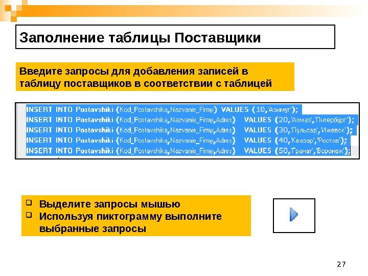27 Заполнение таблицы Поставщики Введите запросы для добавления записей в таблицу поставщиков в соответствии с таблицей Выделите запросы мышью Используя пиктограмму выполните выбранные запросы
