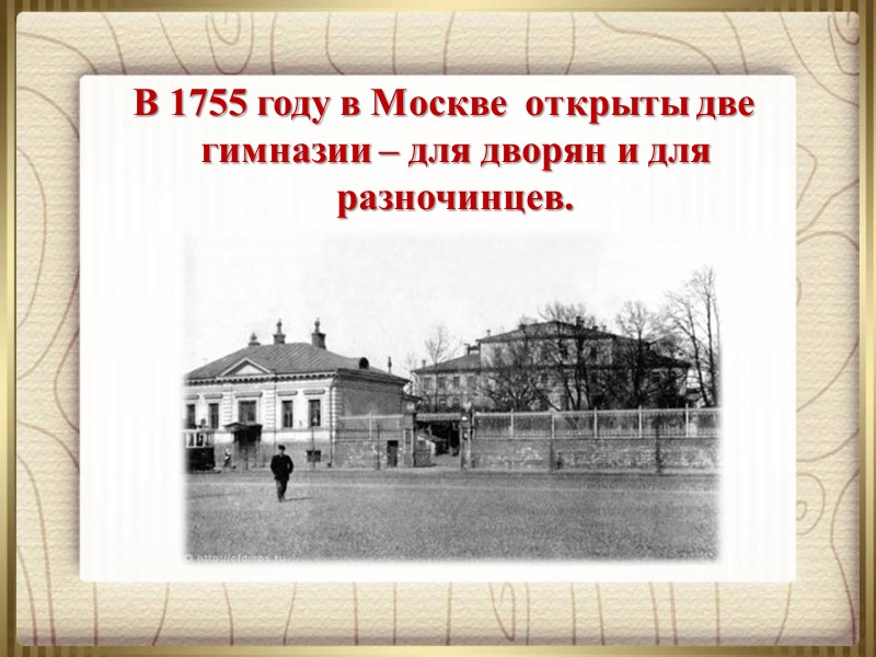 В 1755 году в Москве открыты две гимназии – для дворян и для разночинцев.