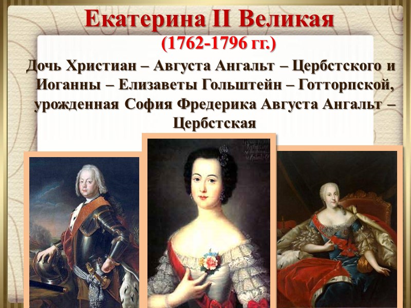 Дочь Христиан – Августа Ангальт – Цербстского и Иоганны – Елизаветы Гольштейн – Готторпской, урожденная София Фредерика Августа Ангальт – Цербстская Екатерина II Великая (1762-1796 гг.)