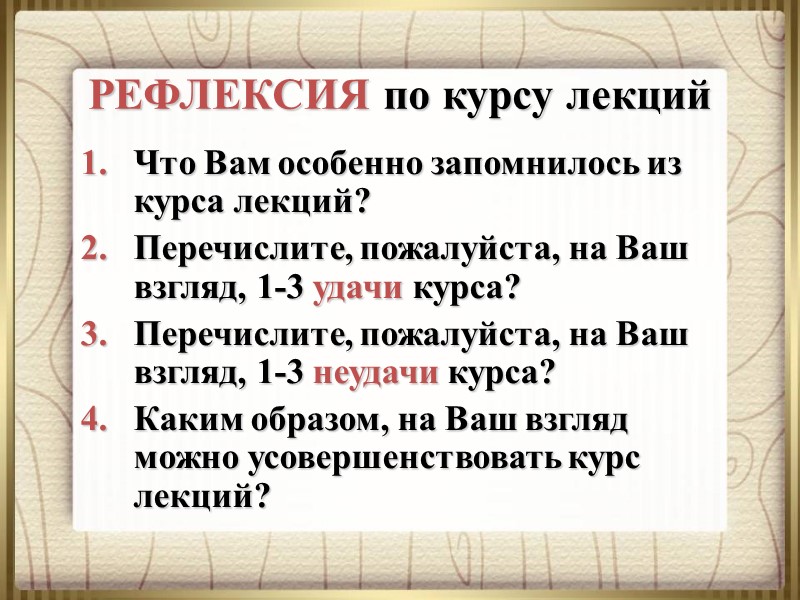РЕФЛЕКСИЯ по курсу лекций Что Вам особенно запомнилось из курса лекций? Перечислите, пожалуйста, на Ваш взгляд, 1-3 удачи курса? Перечислите, пожалуйста, на Ваш взгляд, 1-3 неудачи курса? Каким образом, на Ваш взгляд можно усовершенствовать курс лекций?