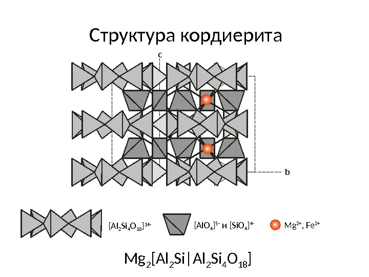 Структура кордиерита bc [Al 2 Si 4 O 18 ] 14 — [Al. O 4 ] 5 — и [Si. O 4 ] 4 — Mg 2+ , Fe 2+ Mg 2 [Al 2 Si|Al 2 Si 4 O 18 ]