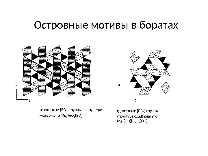 Островные мотивы в боратах a b сдвоенные [BO 3 ] группы в структуре ссайбелиита Mg 2 (OH)[B 2 O 4 (OH)]одиночные [BO 3 ] группы в структуре людвигита Mg 2 Fe. O 2 [BO 3 ]a b