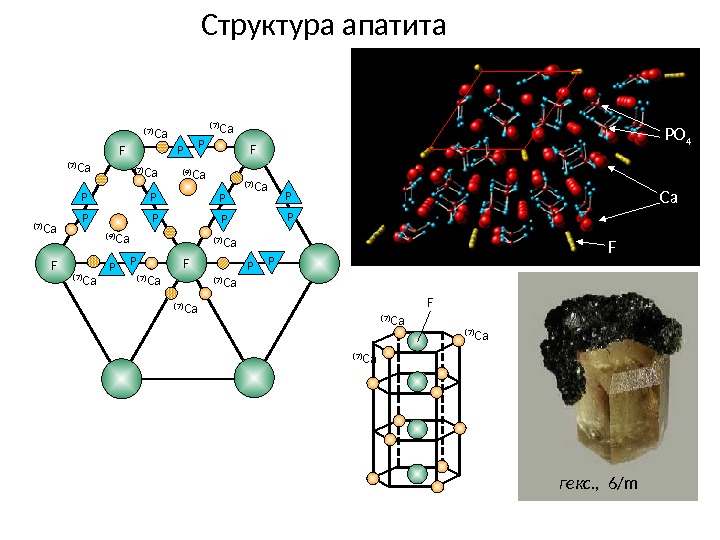 Структура апатита (7) Ca (7) Ca(7) Ca (9) Ca F FF F (7) Ca P P PPP P P F Ca PO 4 гекс. , 6/ m. F (7) Ca
