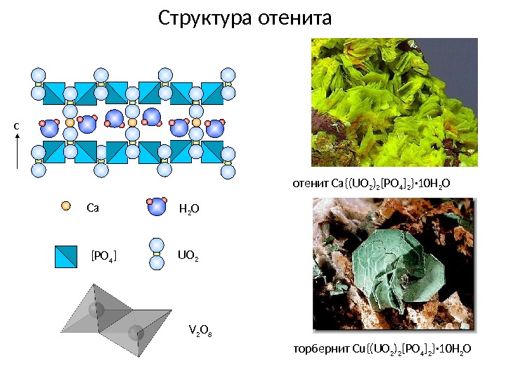 Структура отенит Ca{(UO 2 ) 2 [PO 4 ] 2 } · 10 H 2 O торбернит Cu{(UO 2 ) 2 [PO 4 ] 2 } · 10 H 2 O[PO 4 ]Ca H 2 O UO 2 c V 2 O