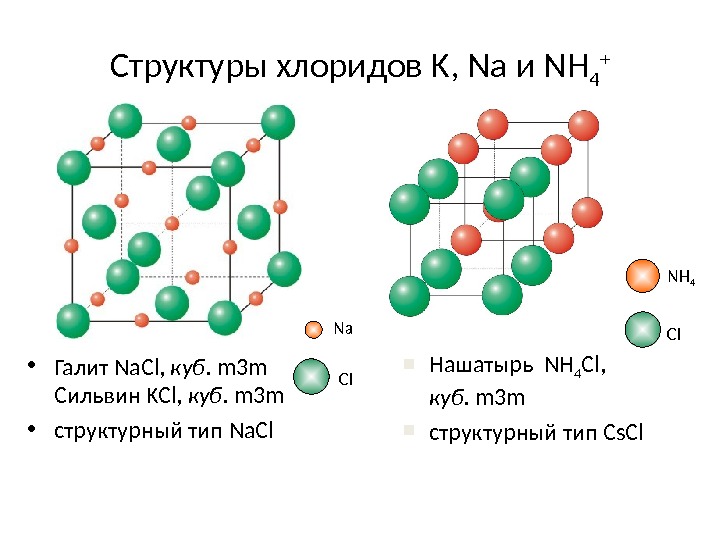 Структуры хлоридов K, Na и NH 4 + • Галит Na. Cl, куб. m 3 m Сильвин KCl, куб. m 3 m • структурный тип Na. Cl Нашатырь NH 4 Cl, куб. m 3 m структурный тип Cs. Cl. Na Cl NH 4 Cl