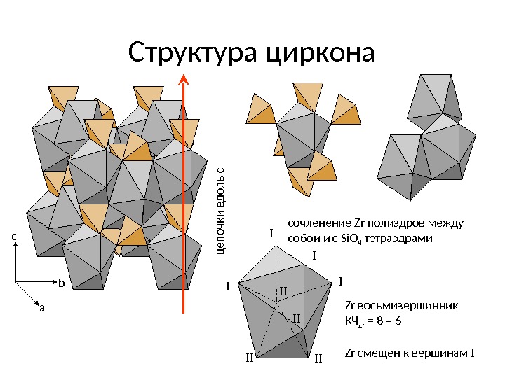 Структура циркона a bc Zr восьмивершинник КЧ Zr = 8 – 6 Zr смещен к вершинам Iсочленение Zr полиэдров между собой и с Si. O 4 тетраэдрами. I I II IIцепочки вдоль с