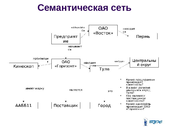 Семантические сети • Семантическая сеть – это ориентированный граф, вершины которого – понятия, а дуги – отношения между ними. – Понятия – абстрактные или конкретные объекты. – Отношения – это связи типа: «это» , «имеет частью» , «принадлежит» , любит» . • Проблема поиска решения в базе знаний сводится к задаче поиска фрагмента сети, представляющего некоторую подсеть, соответствующую поставленному вопросу.