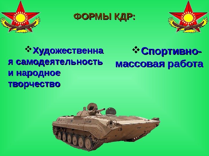 Вывод : КДР наряду с другими формами ВСПР занимает в деятельности командиров и ЗК по ВСПР свое особенно значимое место по воспитанию личного состава в духе высокой боевой готовности, преданности своему народу, президенту и любви к Родине, а также привития личному составу понятии высокой культуры, нравственности, эстетики, художественного вкуса и здорового образа жизни и быта.