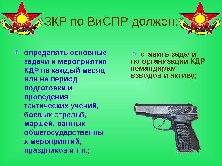 ЗКР по Ви. СПР должен: определять основные задачи и мероприятия КДР на каждый месяц или на период подготовки и проведения тактических учений, боевых стрельб, маршей, важных общегосударственны х мероприятий, праздников и т. п. ; ставить задачи по организации КДР командирам взводов и активу;