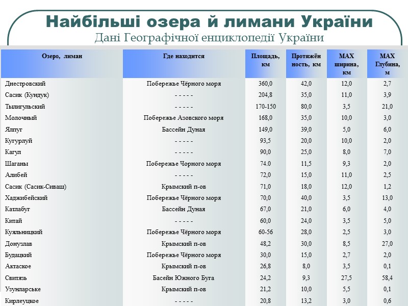 Найбільші озера й лимани України Дані Географічної енциклопедії України