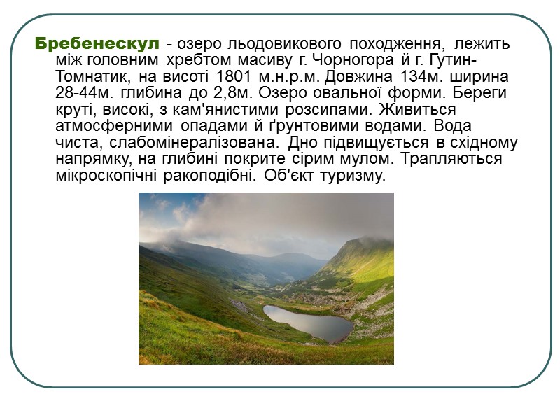 Бребенескул - озеро льодовикового походження, лежить між головним хребтом масиву г. Чорногора й г. Гутин-Томнатик, на висоті 1801 м.н.р.м. Довжина 134м. ширина 28-44м. глибина до 2,8м. Озеро овальної форми. Береги круті, високі, з кам'янистими розсипами. Живиться атмосферними опадами й ґрунтовими водами. Вода чиста, слабомінералізована. Дно підвищується в східному напрямку, на глибині покрите сірим мулом. Трапляються мікроскопічні ракоподібні. Об'єкт туризму.