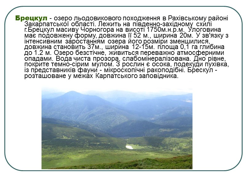 Брецкул - озеро льодовикового походження в Рахівському районі Закарпатської області. Лежить на південно-західному схилі г.Брецкул масиву Чорногора на висоті 1750м.н.р.м. Улоговина має подовжену форму, довжина її 52 м., ширина 20м. У зв'язку з інтенсивним заростанням озера його розміри зменшилися, довжина становить 37м., ширина 12-15м. площа 0,1 га глибина до 1.2 м. Озеро безстічне, живиться переважно атмосферними опадами. Вода чиста прозора, слабомінералізована. Дно рівне, покрите темно-сірим мулом. З рослин є осока, подекуди пухівка, із представників фауни - мікроскопічні ракоподібні. Брескул - розташоване у межах Карпатського заповідника.
