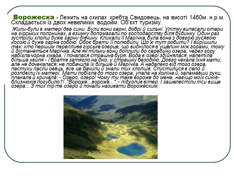 Ворожеска - Лежить на схилах хребта Свидовець, на висоті 1460м. н.р.м. Складається із двох невеликих водойм. Об'єкт туризму. Жили-були в матері два сини. Були вони гарні, добрі й сильні. Улітку випасали отари на гірських полонинах, а взимку допомагали по господарству біля будинку. Один раз зустріли хлопці дуже гарну дівчину. Кликали її Марічка, була вона з довгою русявою косою й дуже гарна собою. Обоє брати її полюбили. Що ж тут робити? І вирішили так: хто першим перепливе гірське озерце, що виднілося в ущелині між горами, тому й дістанеться Марічка. Але як тільки вони доплили до середини озера, через гору набігла чорна хмара, і почалася страшна буря. Вода в озері здійнялася, налетіла більша хвиля - і братів затягло на дно, у страшну безодню. Довго чекала їхня мати, але не дочекалася, не побачила їх більше й Марічка. А недалеко від того озера, пастухи пасли овець, все це бачили й знали тих хлопців. Спустилися в село й розповіли їх матері. Мати побігла до того озера, упала на коліна й, заламавши руки, плакала й кричала: - Озеро, озеро! Чому ти таке вороже до мене, навіщо моїх синів-близнюків погубило?! "Вороже...вороже...", - підхопив вітер. І зашелестіли ліси вище озера:.. З тих пір те озеро й почали називати Ворожеским.