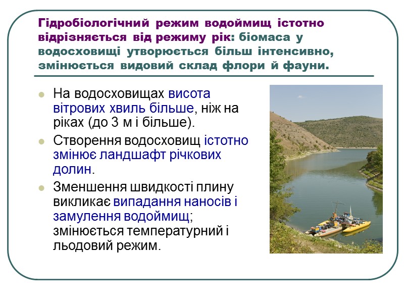 Гідробіологічний режим водоймищ істотно відрізняється від режиму рік: біомаса у водосховищі утворюється більш інтенсивно, змінюється видовий склад флори й фауни. На водосховищах висота вітрових хвиль більше, ніж на ріках (до 3 м і більше). Створення водосховищ істотно змінює ландшафт річкових долин. Зменшення швидкості плину викликає випадання наносів і замулення водоймищ; змінюється температурний і льодовий режим.