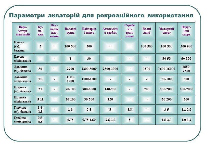 Параметри акваторій для рекреаційного використання