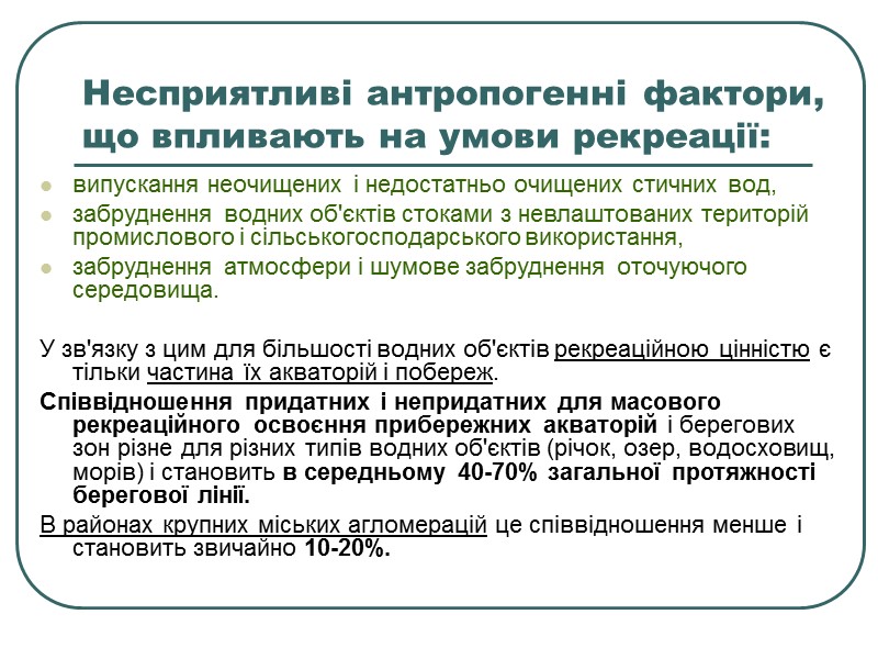 Несприятливі антропогенні фактори, що впливають на умови рекреації: випускання неочищених і недостатньо очищених стичних вод, забруднення водних об'єктів стоками з невлаштованих територій промислового і сільськогосподарського використання, забруднення атмосфери і шумове забруднення оточуючого середовища. У зв'язку з цим для більшості водних об'єктів рекреаційною цінністю є тільки частина їх акваторій і побереж. Співвідношення придатних і непридатних для масового рекреаційного освоєння прибережних акваторій і берегових зон різне для різних типів водних об'єктів (річок, озер, водосховищ, морів) і становить в середньому 40-70% загальної протяжності берегової лінії. В районах крупних міських агломерацій це співвідношення менше і становить звичайно 10-20%.
