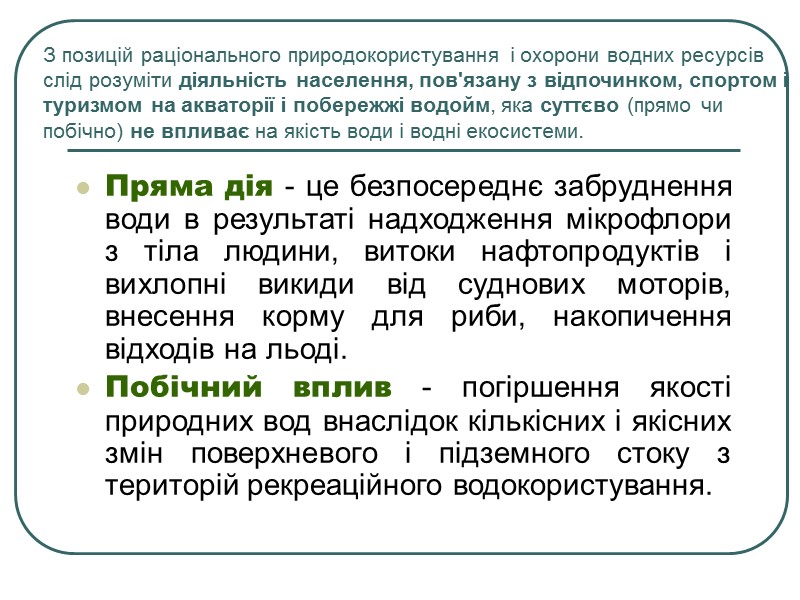 З позицій раціонального природокористування і охорони водних ресурсів слід розуміти діяльність населення, пов'язану з відпочинком, спортом і туризмом на акваторії і побережжі водойм, яка суттєво (прямо чи побічно) не впливає на якість води і водні екосистеми. Пряма дія - це безпосереднє забруднення води в результаті надходження мікрофлори з тіла людини, витоки нафтопродуктів і вихлопні викиди від суднових моторів, внесення корму для риби, накопичення відходів на льоді. Побічний вплив - погіршення якості природних вод внаслідок кількісних і якісних змін поверхневого і підземного стоку з територій рекреаційного водокористування.