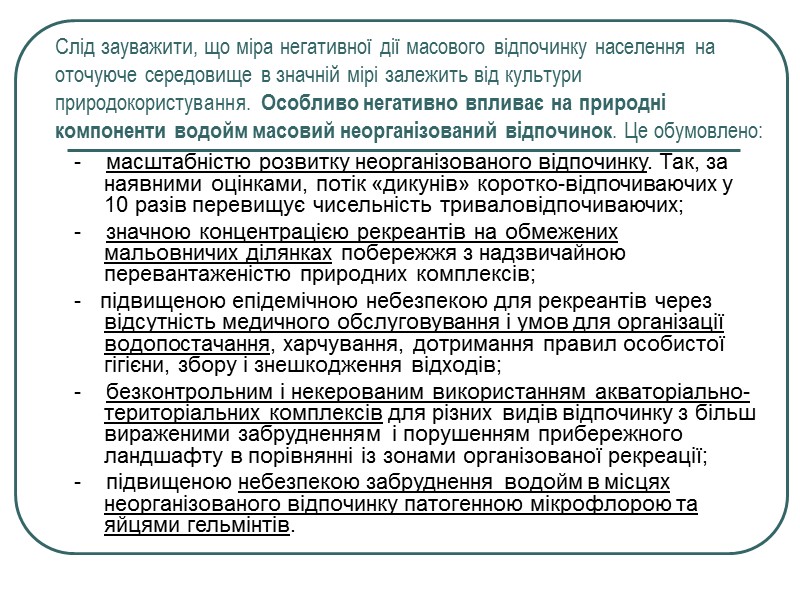 Слід зауважити, що міра негативної дії масового відпочинку населення на оточуюче середовище в значній мірі залежить від культури природокористування. Особливо негативно впливає на природні компоненти водойм масовий неорганізований відпочинок. Це обумовлено: - масштабністю розвитку неорганізованого відпочинку. Так, за наявними оцінками, потік «дикунів» коротко-відпочиваючих у 10 разів перевищує чисельність триваловідпочиваючих; - значною концентрацією рекреантів на обмежених мальовничих ділянках побережжя з надзвичайною перевантаженістю природних комплексів; - підвищеною епідемічною небезпекою для рекреантів через відсутність медичного обслуговування і умов для організації водопостачання, харчування, дотримання правил особистої гігієни, збору і знешкодження відходів; - безконтрольним і некерованим використанням акваторіально-територіальних комплексів для різних видів відпочинку з більш вираженими забрудненням і порушенням прибережного ландшафту в порівнянні із зонами організованої рекреації; - підвищеною небезпекою забруднення водойм в місцях неорганізованого відпочинку патогенною мікрофлорою та яйцями гельмінтів.