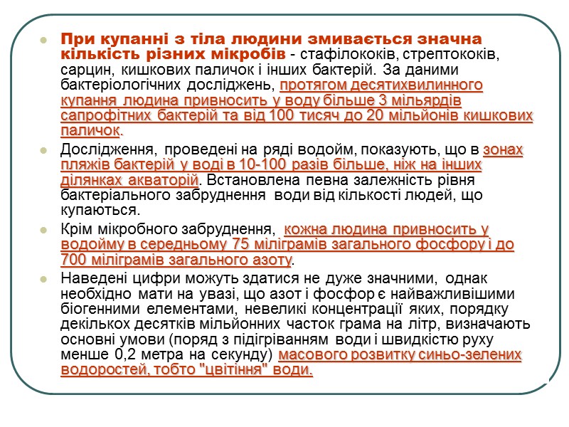 При купанні з тіла людини змивається значна кількість різних мікробів - стафілококів, стрептококів, сарцин, кишкових паличок і інших бактерій. За даними бактеріологічних досліджень, протягом десятихвилинного купання людина привносить у воду більше 3 мільярдів сапрофітних бактерій та від 100 тисяч до 20 мільйонів кишкових паличок. Дослідження, проведені на ряді водойм, показують, що в зонах пляжів бактерій у воді в 10-100 разів більше, ніж на інших ділянках акваторій. Встановлена певна залежність рівня бактеріального забруднення води від кількості людей, що купаються. Крім мікробного забруднення, кожна людина привносить у водойму в середньому 75 міліграмів загального фосфору і до 700 міліграмів загального азоту. Наведені цифри можуть здатися не дуже значними, однак необхідно мати на увазі, що азот і фосфор є найважливішими біогенними елементами, невеликі концентрації яких, порядку декількох десятків мільйонних часток грама на літр, визначають основні умови (поряд з підігріванням води і швидкістю руху менше 0,2 метра на секунду) масового розвитку синьо-зелених водоростей, тобто "цвітіння" води.