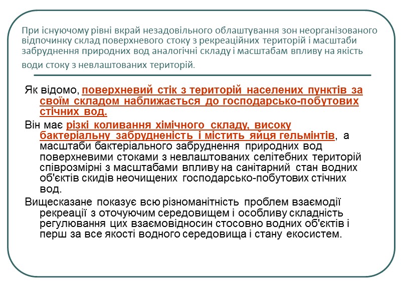 При існуючому рівні вкрай незадовільного облаштування зон неорганізованого відпочинку склад поверхневого стоку з рекреаційних територій і масштаби забруднення природних вод аналогічні складу і масштабам впливу на якість води стоку з невлаштованих територій. Як відомо, поверхневий стік з територій населених пунктів за своїм складом наближається до господарсько-побутових стічних вод. Він має різкі коливання хімічного складу, високу бактеріальну забрудненість і містить яйця гельмінтів, а масштаби бактеріального забруднення природних вод поверхневими стоками з невлаштованих селітебних територій співрозмірні з масштабами впливу на санітарний стан водних об'єктів скидів неочищених господарсько-побутових стічних вод. Вищесказане показує всю різноманітність проблем взаємодії рекреації з оточуючим середовищем і особливу складність регулювання цих взаємовідносин стосовно водних об'єктів і перш за все якості водного середовища і стану екосистем.
