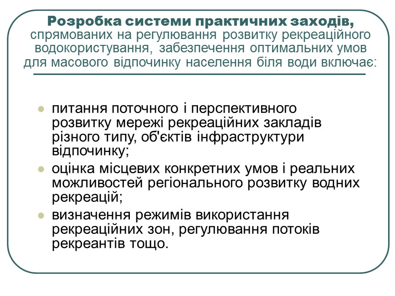 Розробка системи практичних заходів, спрямованих на регулювання розвитку рекреаційного водокористування, забезпечення оптимальних умов для масового відпочинку населення біля води включає: питання поточного і перспективного розвитку мережі рекреаційних закладів різного типу, об'єктів інфраструктури відпочинку; оцінка місцевих конкретних умов і реальних можливостей регіонального розвитку водних рекреацій; визначення режимів використання рекреаційних зон, регулювання потоків рекреантів тощо.