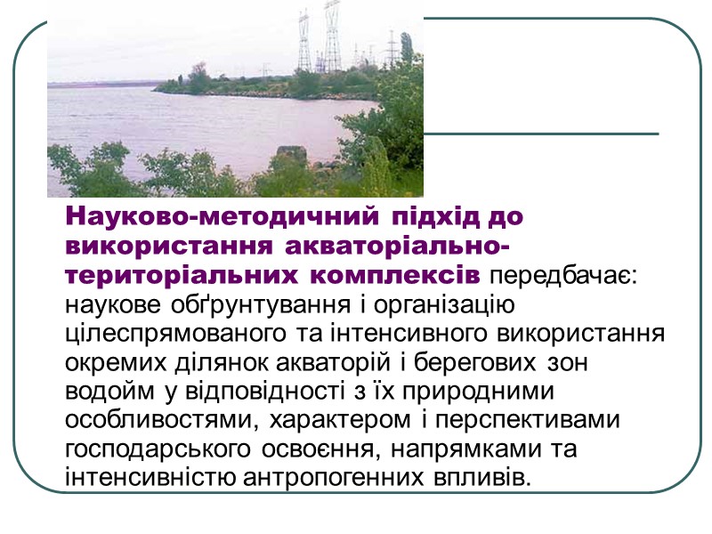 Науково-методичний підхід до використання акваторіально-територіальних комплексів передбачає: наукове обґрунтування і організацію цілеспрямованого та інтенсивного використання окремих ділянок акваторій і берегових зон водойм у відповідності з їх природними особливостями, характером і перспективами господарського освоєння, напрямками та інтенсивністю антропогенних впливів.