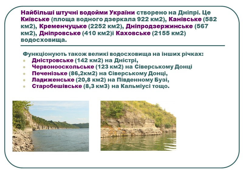 Найбільші штучні водойми України створено на Дніпрі. Це Київське (площа водного дзеркала 922 км2), Канівське (582 км2), Кременчуцьке (2252 км2), Дніпродзержинське (567 км2), Дніпровське (410 км2)і Каховське (2155 км2) водосховища. …………………………………………………… Функціонують також великі водосховища на інших річках: Дністровське (142 км2) на Дністрі, Червонооскольське (123 км2) на Сіверському Донці Печенізьке (86,2км2) на Сіверському Донці, Ладиженське (20,8 км2) на Південному Бузі, Старобешівське (8,3 км3) на Кальміусі тощо.